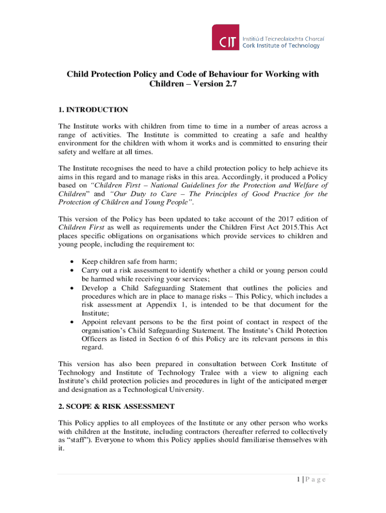 Child Protection Policy and Code of Behavior for Working with Children Version 2.7 1. INTRODUCTION The Institute works with children from time to time in a number of areas across a range of activities.