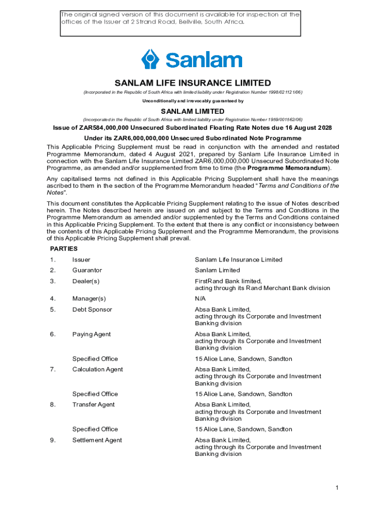 The original signed version of this document is available for inspection at the offices of the Issuer at 2 Strand Road, Bellville, South Africa. SANTA LIFE INSURANCE LIMITED (Incorporated in the Republic