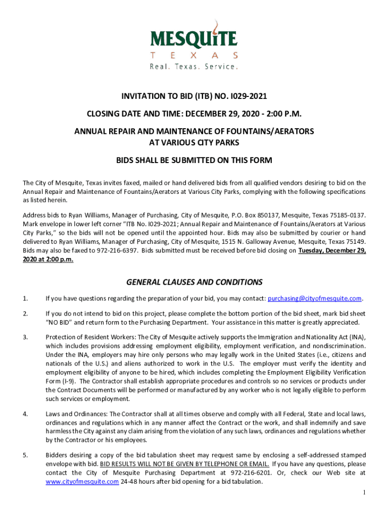 INFORMAL PAPER INVITATION TO BID (ITB) NO. I0292021 CLOSING DATE AND TIME: DECEMBER 29, 2020 2:00 P.M. ANNUAL REPAIR AND MAINTENANCE OF FOUNTAINS/AERATORS AT VARIOUS CITY PARKS BIDS SHALL BE SUBMITTED