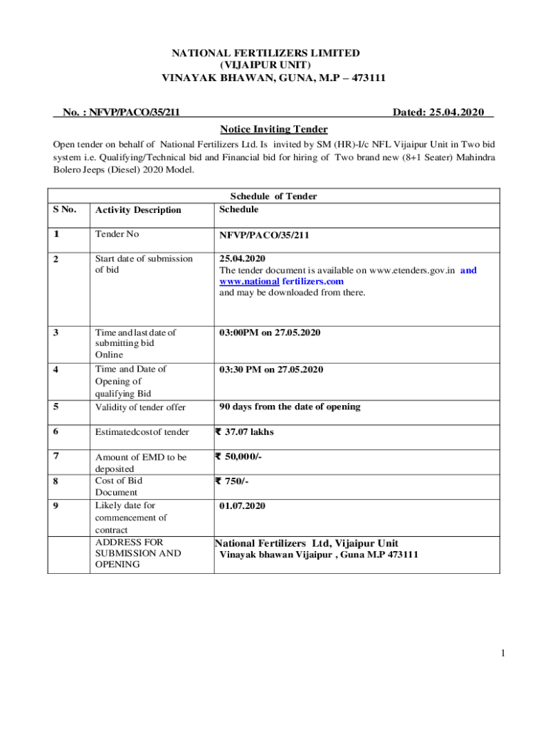 Get the free notice inviting tender (nit) - National Fertilizers Limited