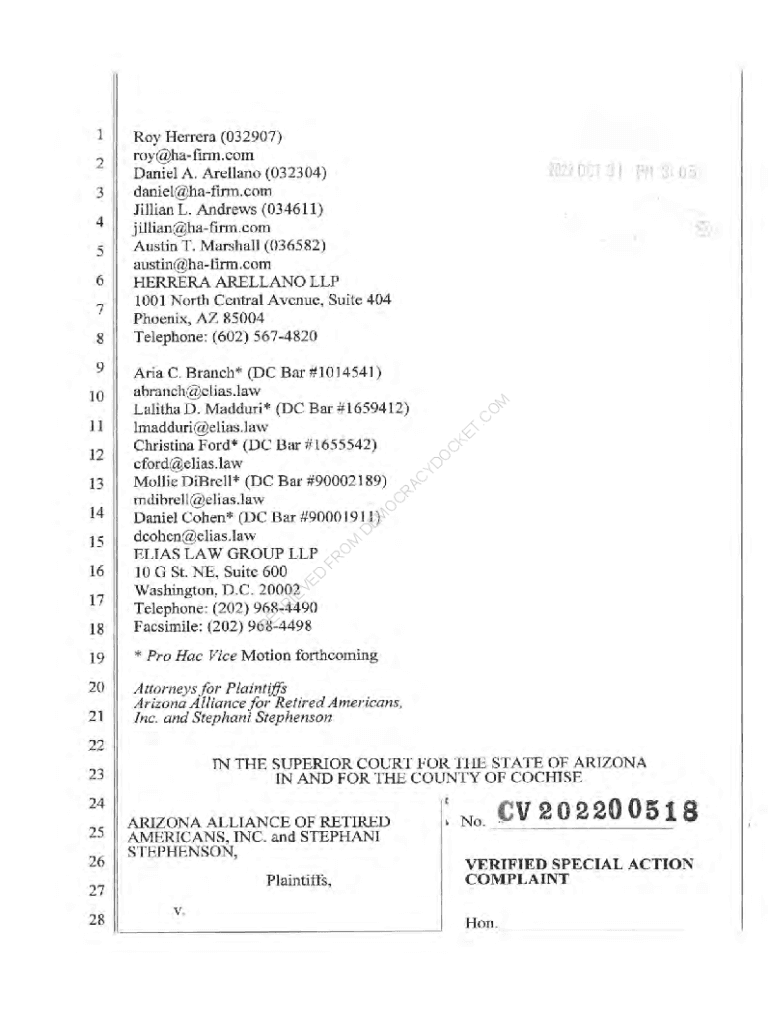 6 7 8 919* Pro HAE Vice Motion forthcoming20Attorneys for Plaintiffs Arizona Alliance for Retired Americans, Inc. and Stefan Stephenson11 121721EMDMOFRVE DIE16ET R15R14OC13R10AC18Aria C. Branch* (DC
