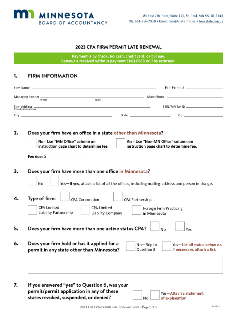 B O A R D O F A C C O U N TA N C Y85 East 7th Place, Suite 125, St. Paul, MN 551012143 pH: 6512967938 Email: boa@state.mn.us boa.state.MN.us2023 CPA FIRM PERMIT LATE RENEWALINSTRUCTIONSALL firms MUST