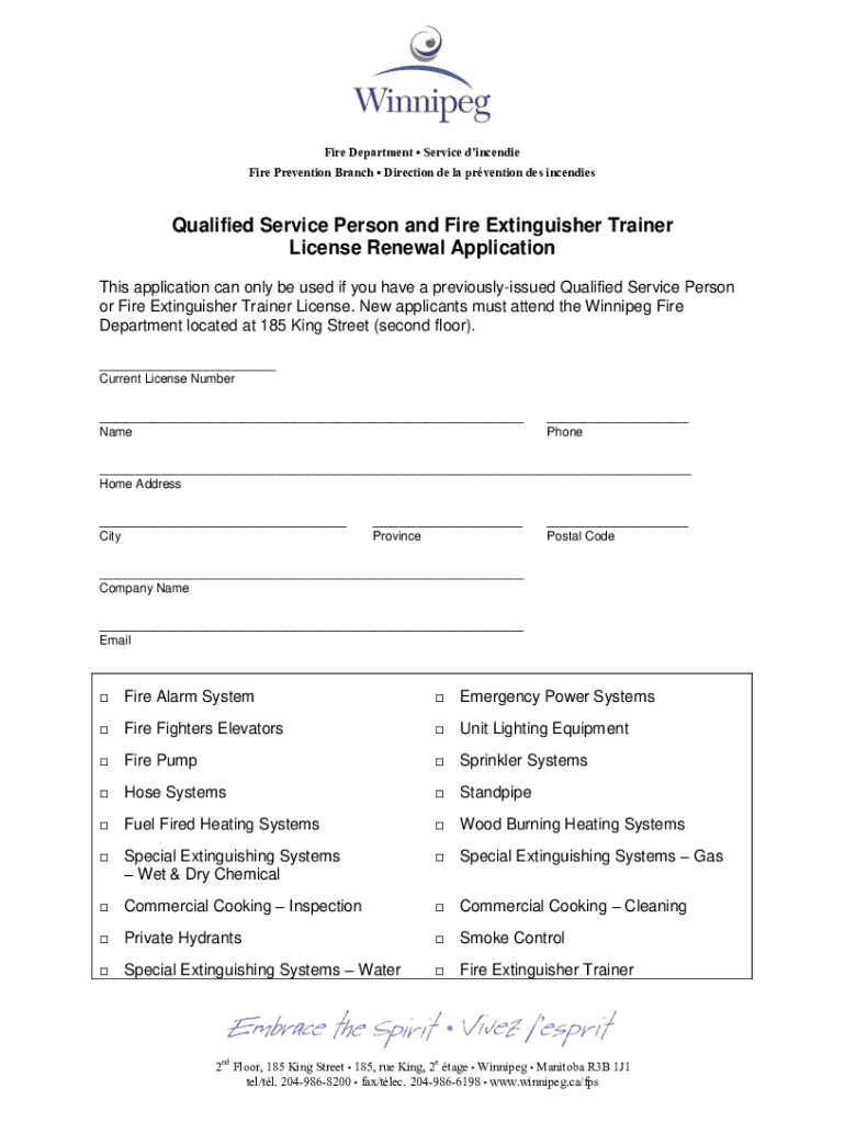 Fire Department Service d\'incentive Fire Prevention Branch Direction DE la prevention DES incendiesQualified Service Person and Fire Extinguisher Trainer License Renewal Application This application