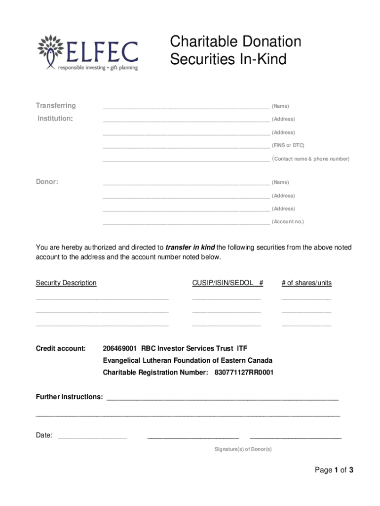 Charitable Donation Securities Inking Transferring___ (Name)Institution:___ (Address) ___ (Address) ___ (FINS or DTC) ___ (Contact name & phone number)Donor:___ (Name) ___ (Address) ___ (Address)