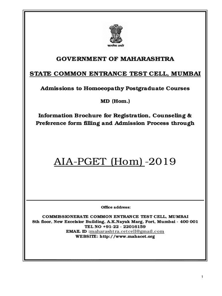 GOVERNMENT OF MAHARASHTRA STATE COMMON ENTRANCE TEST CELL, MUMBAI Admissions to Homeopathy Postgraduate Courses MD (HOM.) Information Brochure for Registration, Counseling & Preference form filling
