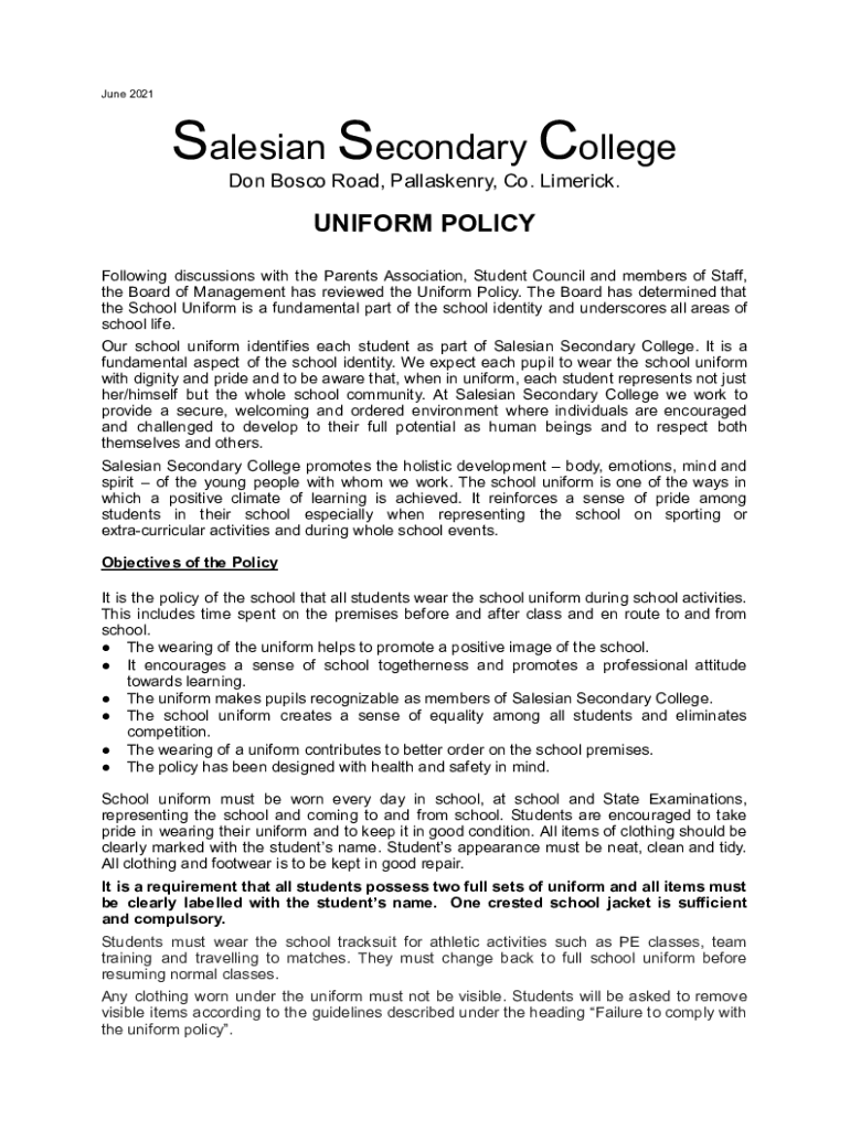 June 2021Salesian Secondary College Don Bosco Road, Pallaskenry, Co. Limerick. UNIFORM POLICY Following discussions with the Parents Association, Student Council and members of Staff, the Board of