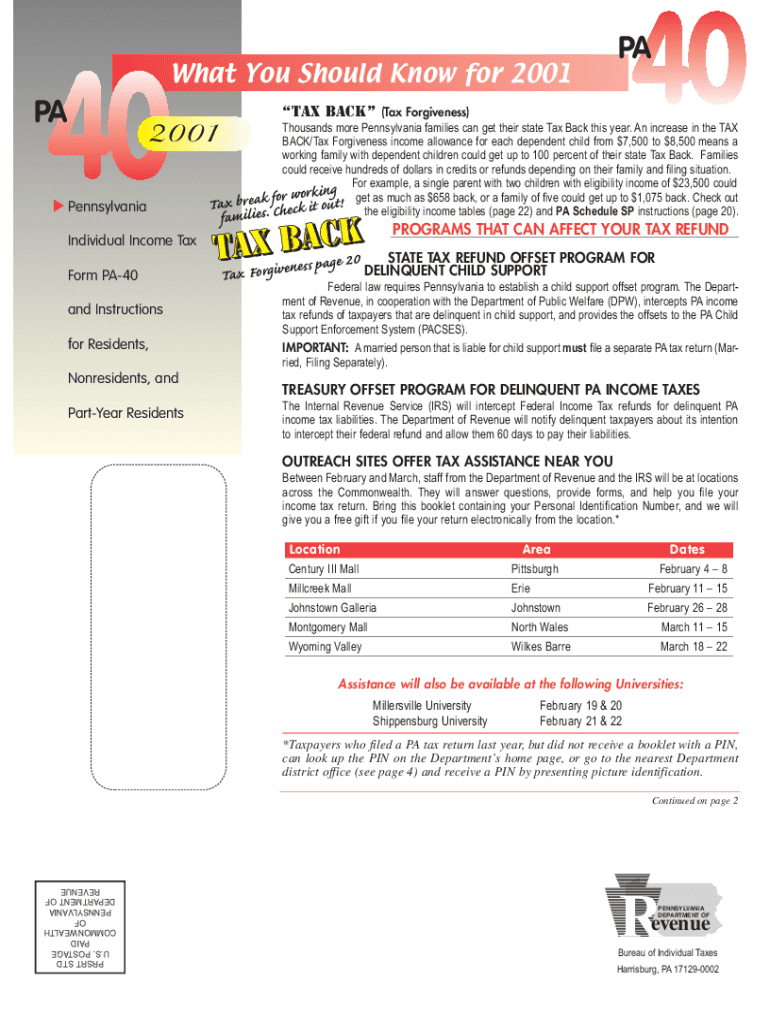 What You Should Know for 2001PATAX BACK (Tax Forgiveness)2001PennsylvaniaThousands more Pennsylvania families can get their state Tax Back this year. An increase in the TAX BACK/Tax Forgiveness income