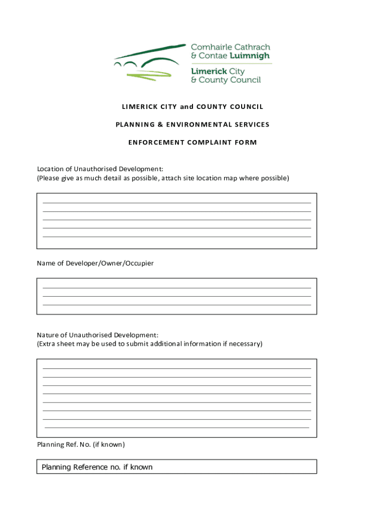 LIMERICK CITY and COUNTY COUNCIL PLANNING & ENVIRONMENTAL SERVICES ENFORCEMENT COMPLAINT Formation of Unauthorized Development: (Please give as much detail as possible, attach site location map where