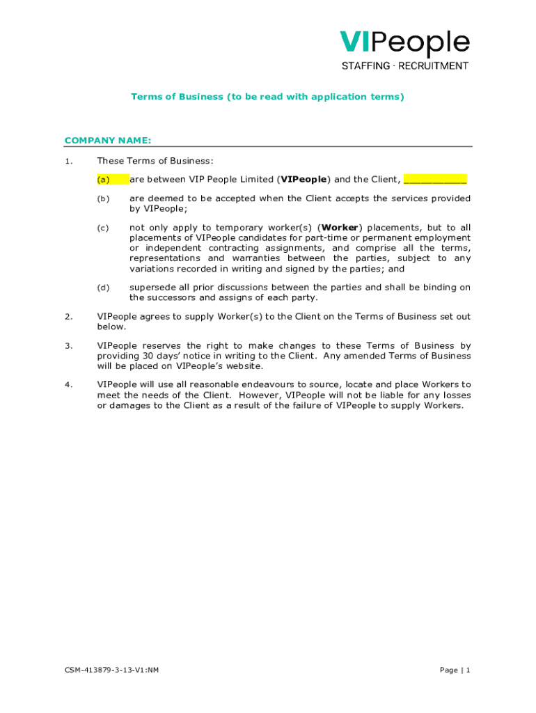 Terms of Business (to be read with application terms)COMPANY NAME: 1. These Terms of Business: (a)are between VIP People Limited (People) and the Client, ___(b)are deemed to be accepted when the Client