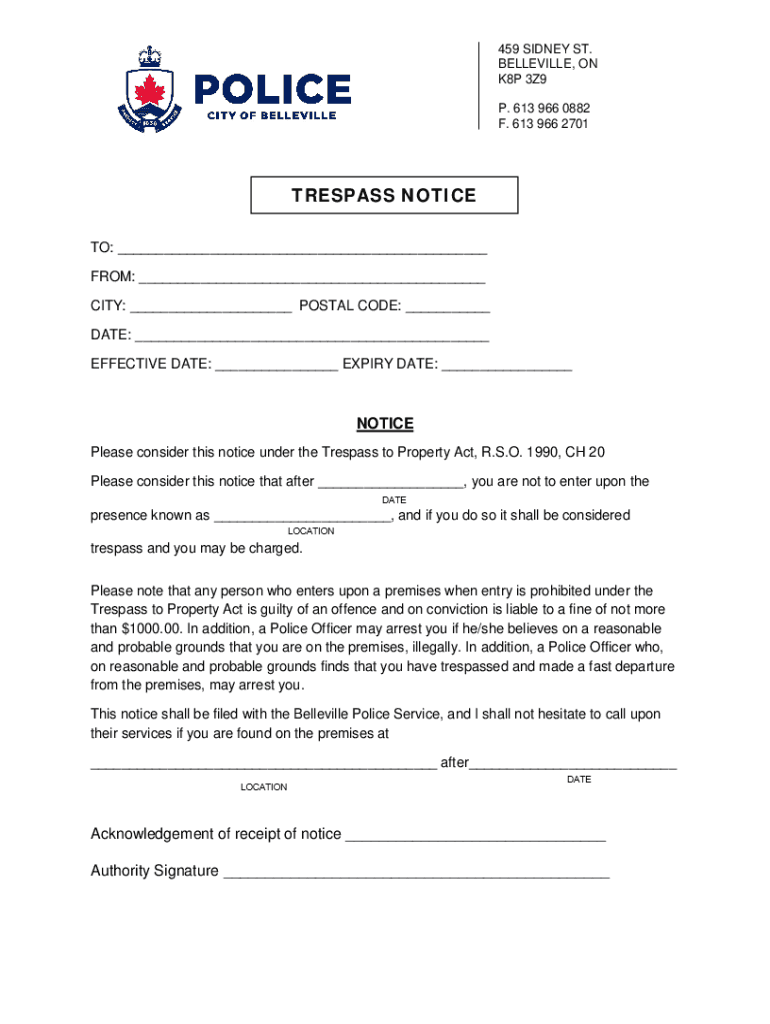 459 SIDNEY ST. BELLEVILLE, ON K8P 3Z9 P. 613 966 0882 F. 613 966 2701TRESPASS NOTICE TO: ___ FROM: ___ CITY: ___ POSTAL CODE: ___ DATE: ___ EFFECTIVE DATE: ___ EXPIRY DATE: ___NOTICE Please consider