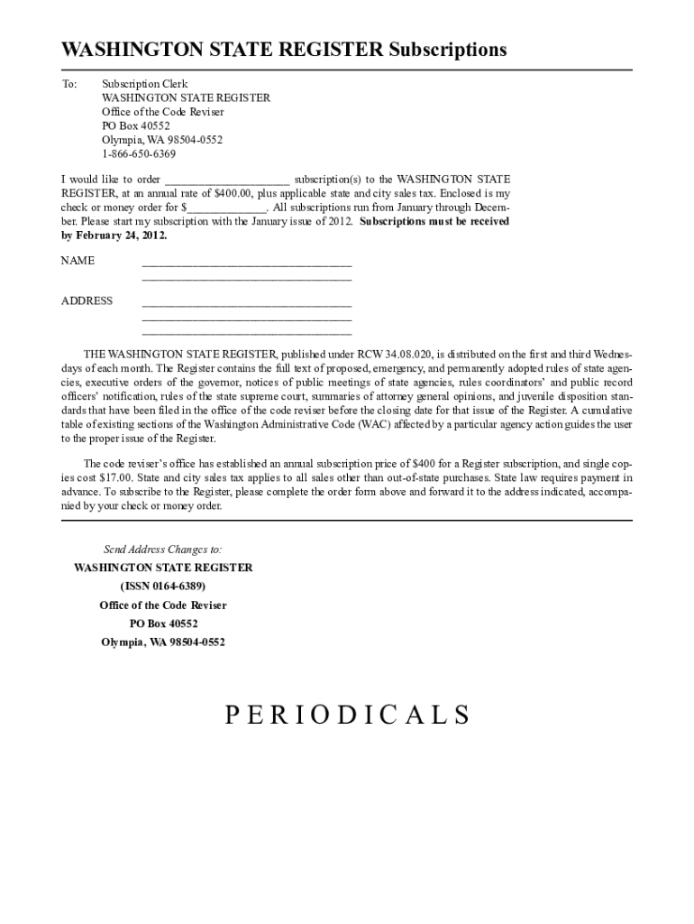 WASHINGTON STATE REGISTER Subscriptions To:Subscription Clerk WASHINGTON STATE REGISTER Office of the Code Reviser PO Box 40552 Olympia, WA 985040552 18666506369I would like to order ___ subscription(s)