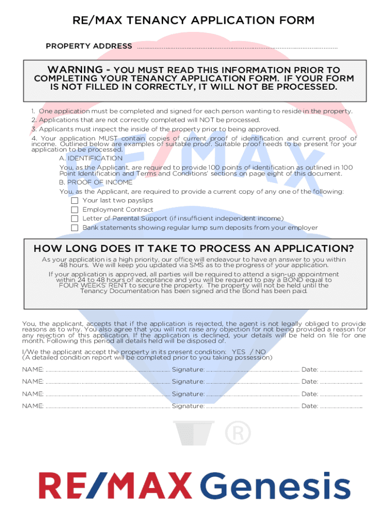 RE/MAX TENANCY APPLICATION FORM PROPERTY ADDRESS WARNING YOU MUST READ THIS INFORMATION PRIOR TO COMPLETING YOUR TENANCY APPLICATION FORM. IF YOUR FORM IS NOT FILLED IN CORRECTLY, IT WILL NOT BE PROCESSED.