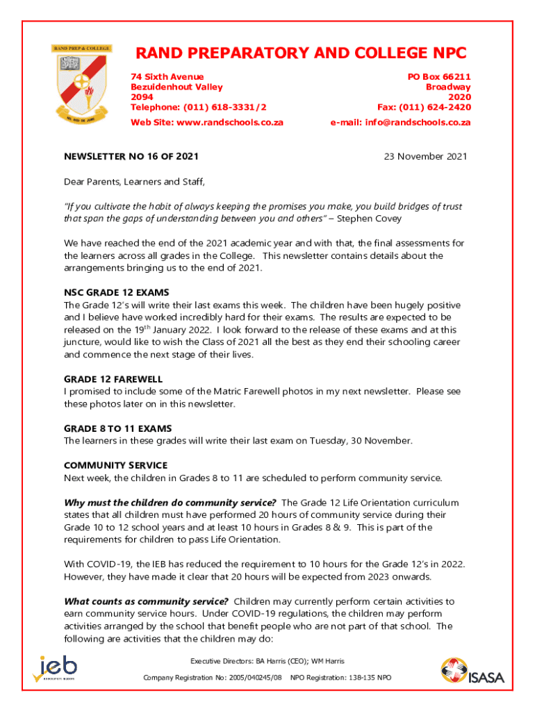 RAND PREPARATORY AND COLLEGE NPC 74 Sixth Avenue Bezuidenhout Valley 2094 Telephone: (011) 6183331/2 Website: www.randschools.co.zaPO Box 66211 Broadway 2020 Fax: (011) 6242420 email: info@randschools.co.zaNEWSLETTER