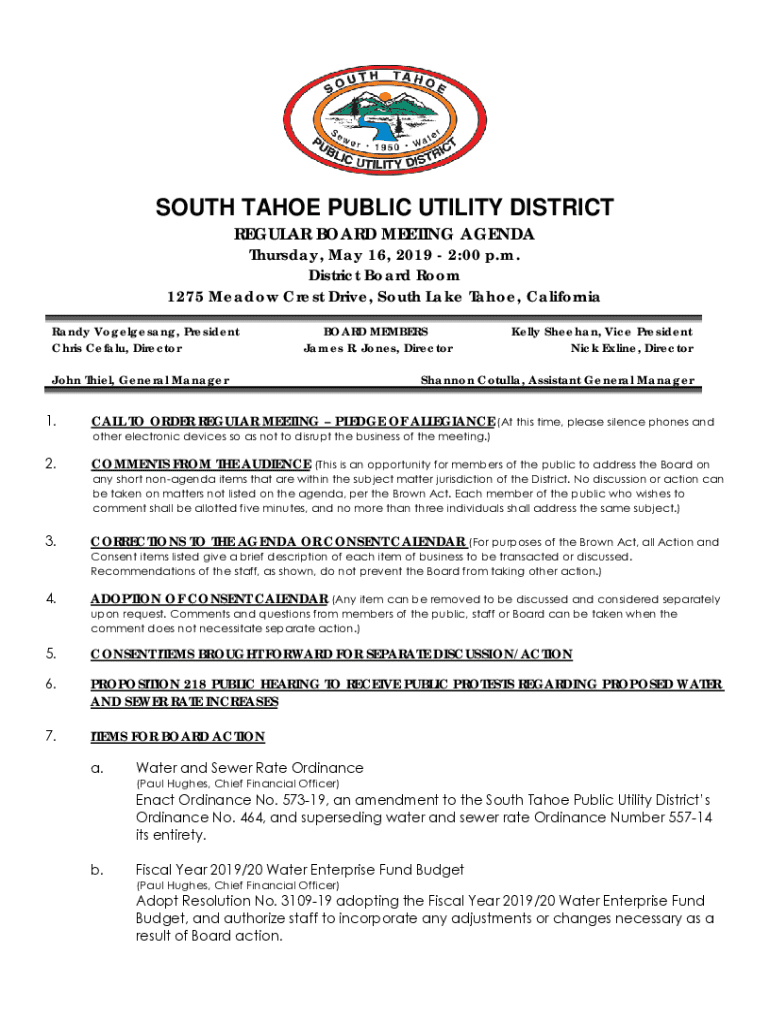 SOUTH TAHOE PUBLIC UTILITY DISTRICT REGULAR BOARD MEETING AGENDA Thursday, May 16, 2019 2:00 p.m. District Board Room 1275 Meadow Crest Drive, South Lake Tahoe, California Randy Vogelgesang, President