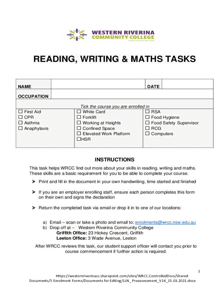 READING, WRITING & Math TASKSNAMEDATEOCCUPATION First Aid