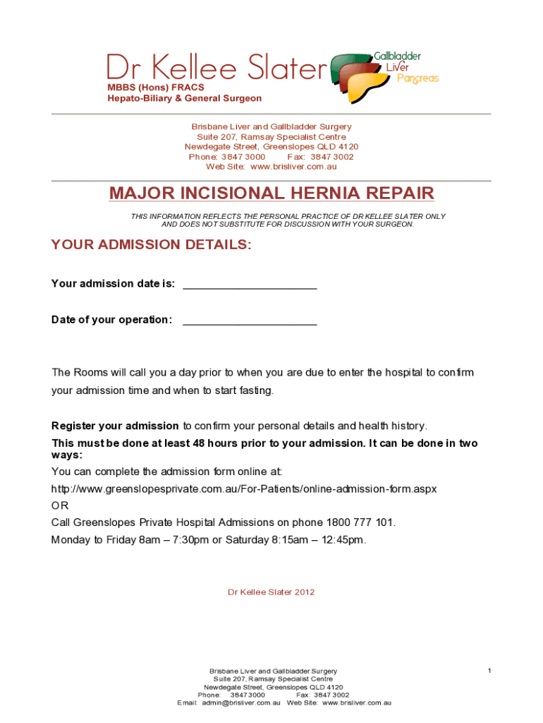 Brisbane Liver and Gallbladder Surgery Suite 207, Ramsay Specialist Center Woodgate Street, Green slopes QLD 4120 Phone: 3847 3000 Fax: 3847 3002 Website: www.brisliver.com.auMAJOR INCISIONAL HERNIA