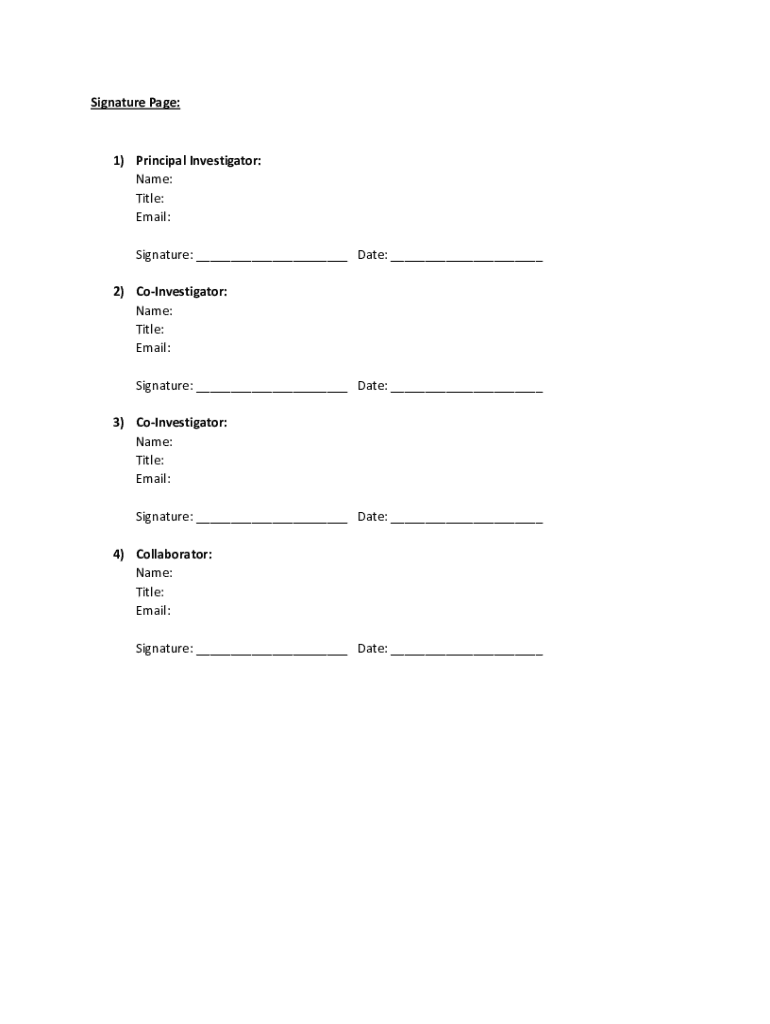 Signature Page:1) Principal Investigator: Name: Title: Email: Signature: ___ Date: ___ 2) Investigator: Name: Title: Email: Signature: ___ Date: ___ 3) Investigator: Name: Title: Email: Signature: