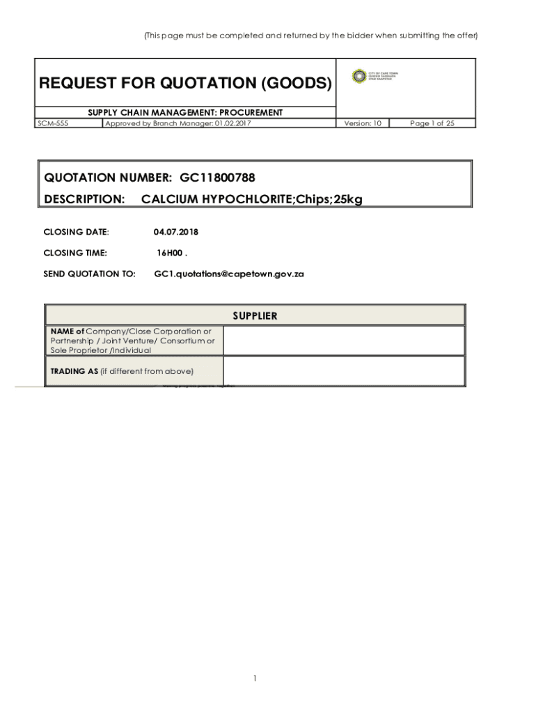(This page must be completed and returned by the bidder when submitting the offer)REQUEST FOR QUOTATION (GOODS) SUPPLY CHAIN MANAGEMENT: PROCUREMENT SCM555Approved by Branch Manager: 01.02.2017Version: