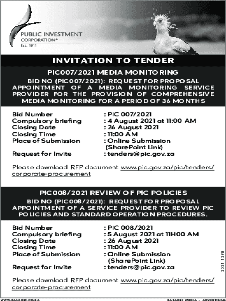 INVITATION TO TENDER PIC007/2021 MEDIA MONITORING BID NO (PIC007/2021): REQUEST FOR PROPOSAL APPOINTMENT OF A MEDIA MONITORING SERVICE PROVIDER FOR THE PROVISION OF COMPREHENSIVE MEDIA MONITORING