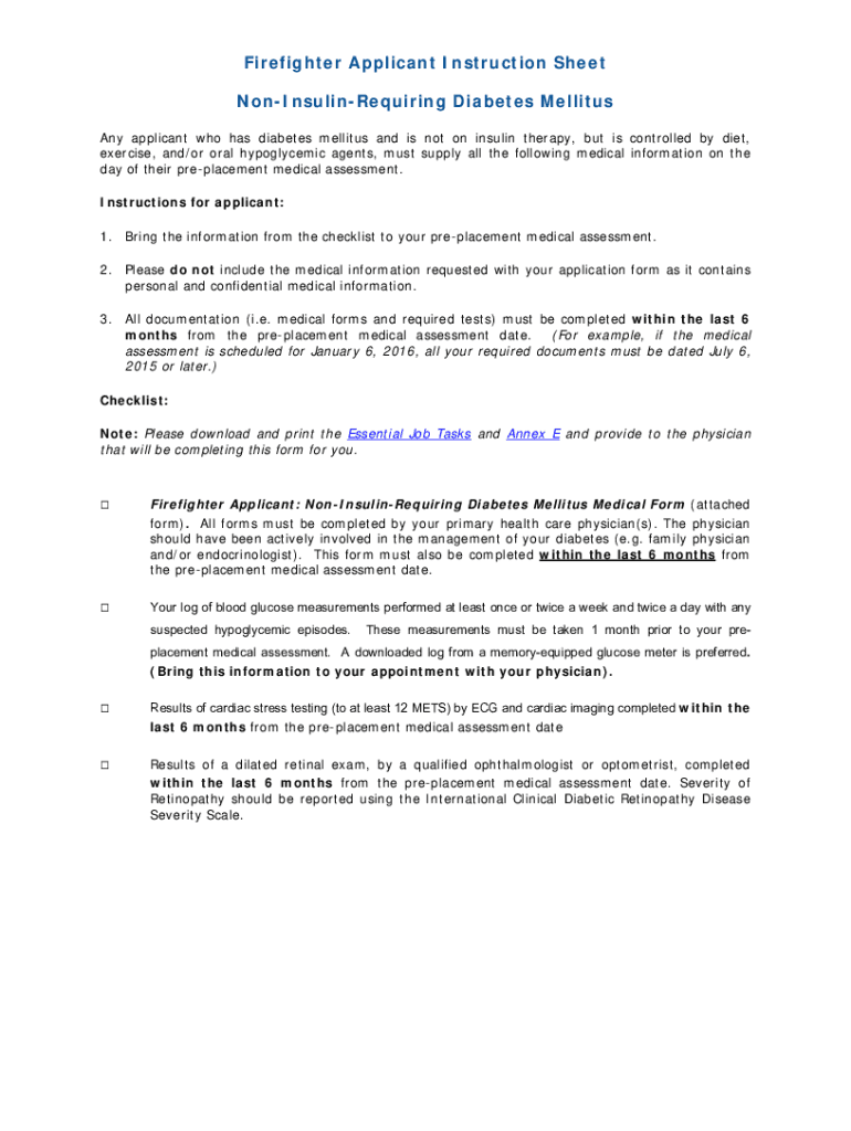 Firefighter Applicant Instruction Sheet NonInsulinRequiring Diabetes Mellitus Any applicant who has diabetes mellitus and is not on therapy, but is controlled by diet, exercise, and/or oral hypoglycemic