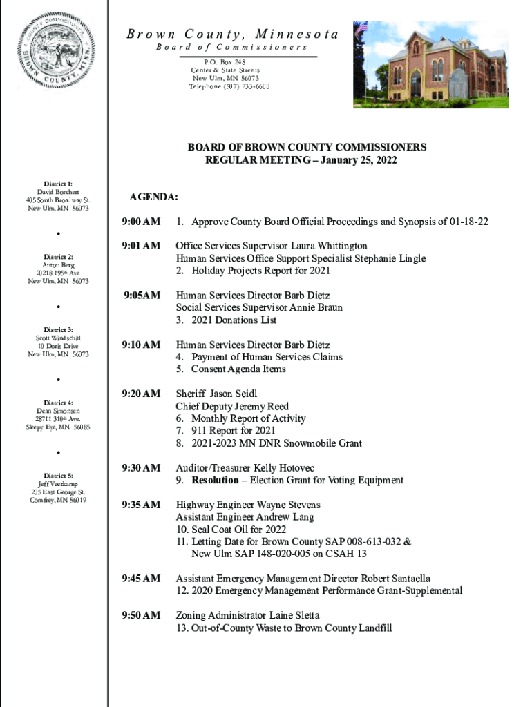 Bro w n C o u n t y, M i n BS o t a Board commissioner SP. O. Box 248 Center & State Streets New Ulm, MN 56073 Telephone (507) 2336600BOARD OF BROWN COUNTY COMMISSIONERS REGULAR MEETING January 25,