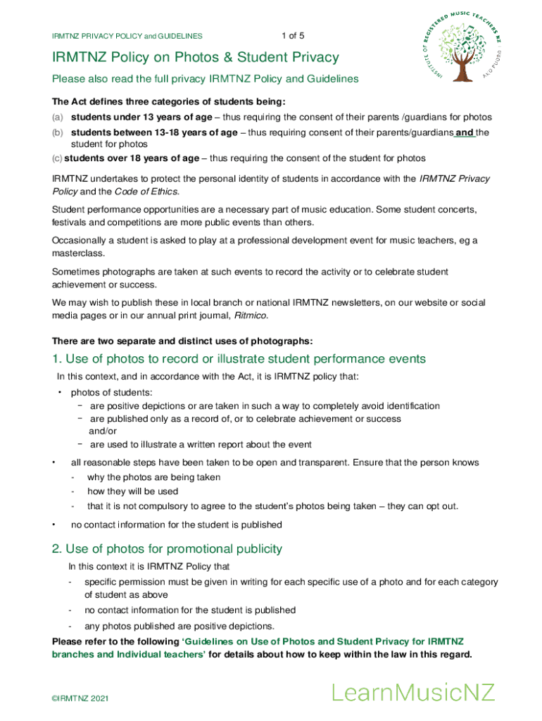 Get the free IRMTNZ Policy on Photos & Student Privacy - Learn Music NZ