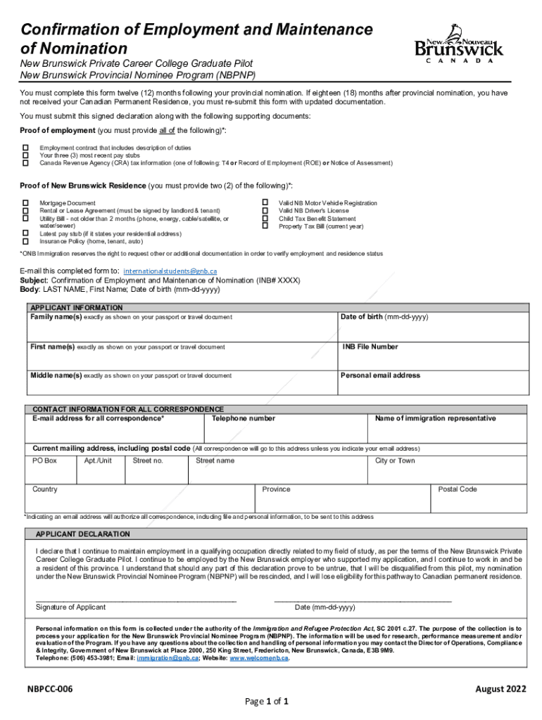 Confirmation of Employment and Maintenance of Nomination New Brunswick Private Career College Graduate Pilot New Brunswick Provincial Nominee Program (NB PNP)You must complete this form twelve (12)
