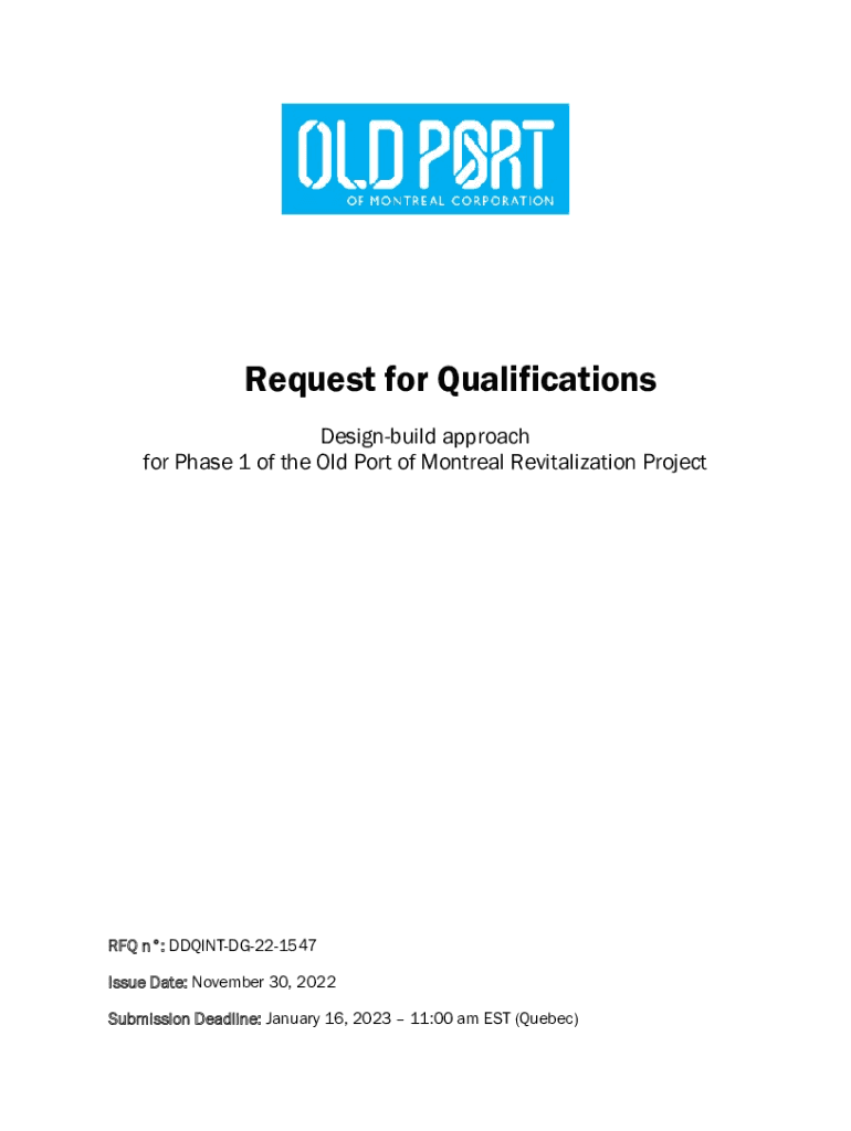 Request for Qualifications Design build approach for Phase 1 of the Old Port of Montreal Revitalization Project n: DDQINTDG221547 Issue Date: November 30, 2023, Submission Deadline: January 16, 2023