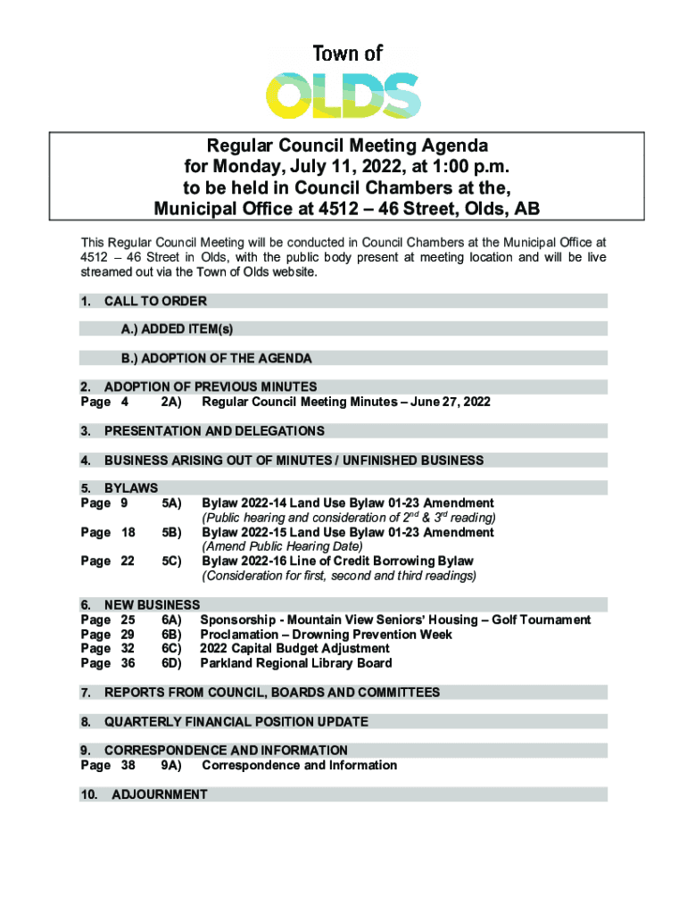 Regular Council Meeting Agenda for Monday, July 11, 2023, at 1:00 p.m. to be held in Council Chambers at the, Municipal Office at 4512 46 Street, Olds, AB This Regular Council Meeting will be conducted