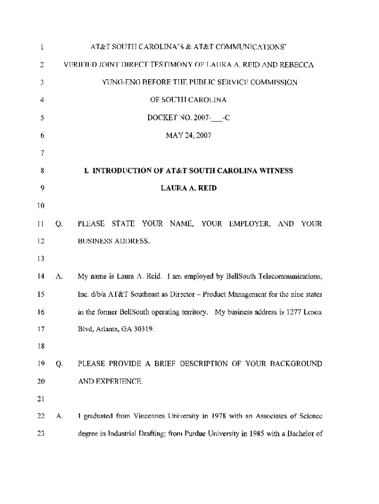 ATILT SOUTH CAROLINA\' S k, ATILT COMMUNICATIONS\'VERIFIED JOINT DIRECT TESTIMONY OF LAURA A. REID AND REBECCA2YUNGENG BEFORE TIE PUBLIC SERVICE COMMISSION SOU1H CAROLINACDOCKET VO. 2007\'.MAY 24,