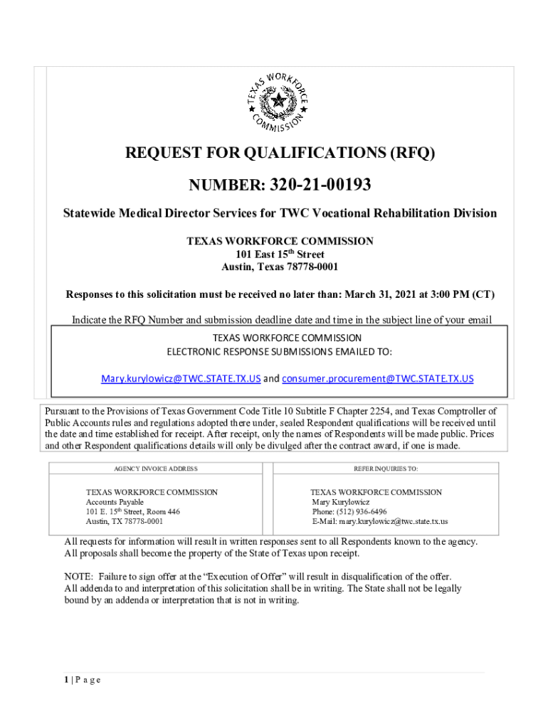 REQUEST FOR QUALIFICATIONS (RFQ) NUMBER: 3202100193 Statewide Medical Director Services for TWC Vocational Rehabilitation Division TEXAS WORKFORCE COMMISSION 101 East 15th Street Austin, Texas 787780001