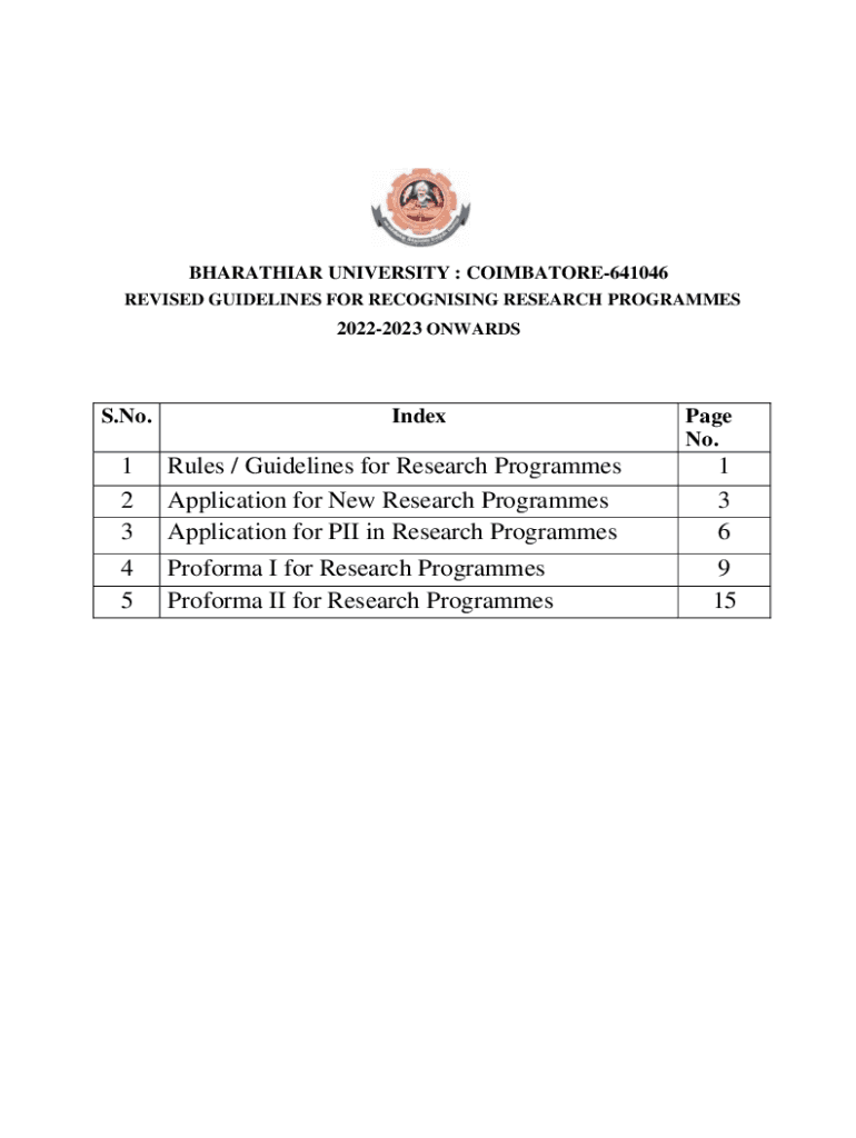 BHARATHIAR UNIVERSITY : COIMBATORE641046 REVISED GUIDELINES FOR Recognizing RESEARCH PROGRAMMES20222023 ONWARD SS. No. Index Page No.1 2 3Rules / Guidelines for Research Programs Application for New