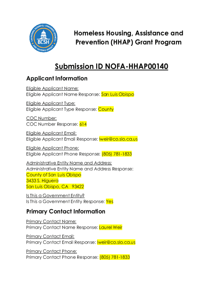 Homeless Housing, Assistance and Prevention (HEAP) Grant ProgramSubmission ID NOFAHHAP00140 Applicant Information Eligible Applicant Name: Eligible Applicant Name Response: San Luis Obispo Eligible