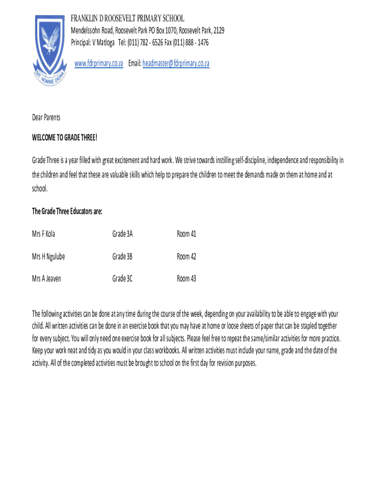 FRANKLIN D ROOSEVELT PRIMARY SCHOOL Mendelssohn Road, Roosevelt Park PO Box 1070, Roosevelt Park, 2129 Principal: V Malaga Tel: (011) 782 6526 Fax (011) 888 1476 www.fdrprimary.co.za Email: headmaster@fdrprimary.co.zaDear