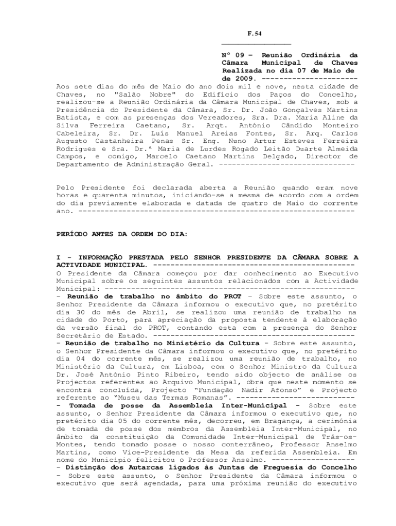 F. 54 ___N 09 Reunion Ordinary the Clara Municipal de Chaves Realized no did 07 de Mai ode 2009. AOS set Dias do ms de Main do ANO does mil e love, nest MIDADE de Chaves, no \” Sale Noble\” do