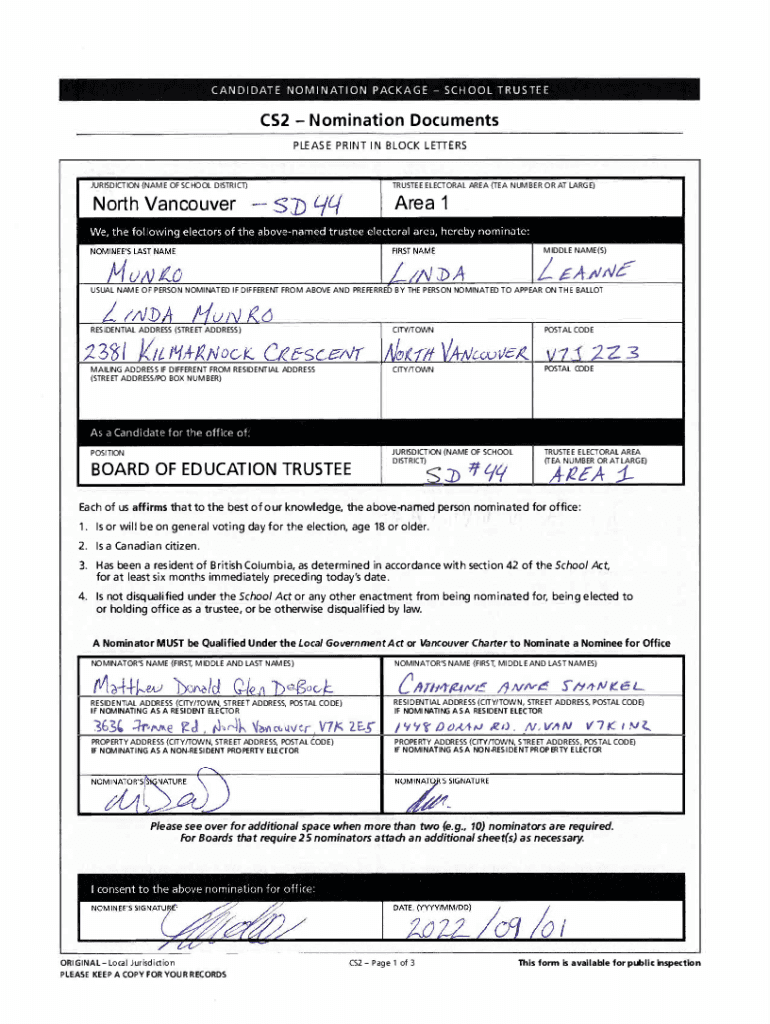 CANDIDATE NOMINATION PACKAGE SCHOOL TRUSTEECS2 Nomination Documents PLEASE PRINT IN BLOCK LETTERS TRUSTEE ELECTORAL AREA (TEA NUMBER OR AT LARGE)JURISDICTION (NAME OF SCHOOL DISTRICTIArea 1North Vancouver