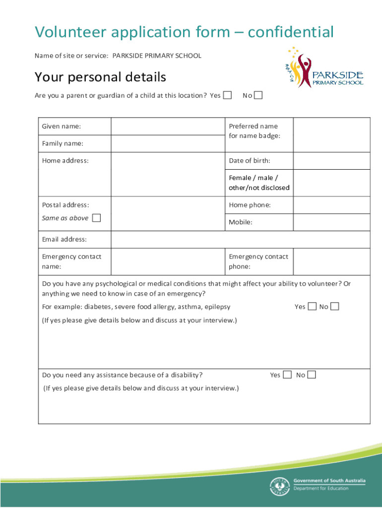 Volunteer application form confidential Name of site or service: PARKS IDE PRIMARY Schoolboy personal details Are you a parent or guardian of a child at this location? Misgiven name:Preferred name