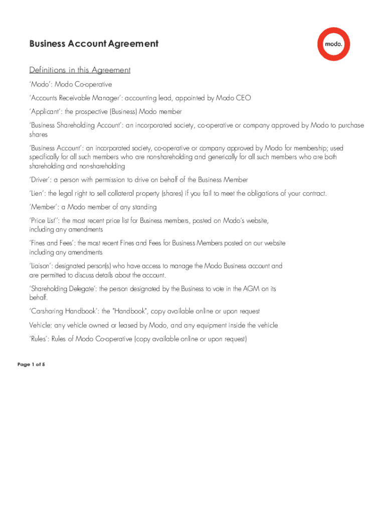 Business account agreementmodo is a document outlining the terms and conditions of a business account.