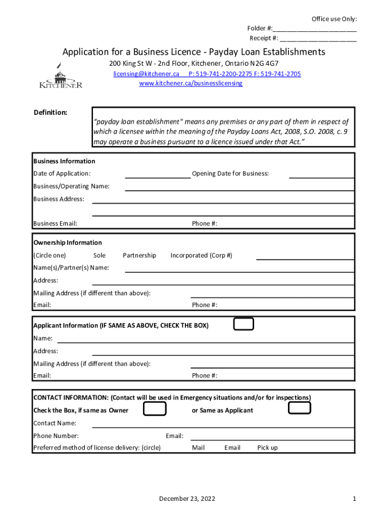 Office use Only: Folder #:___ Receipt #: ___Application for a Business License Payday Loan Establishments 200 King St W 2nd Floor, Kitchener, Ontario N2G 4G7 licensing@kitchener.ca P: 51974122002275