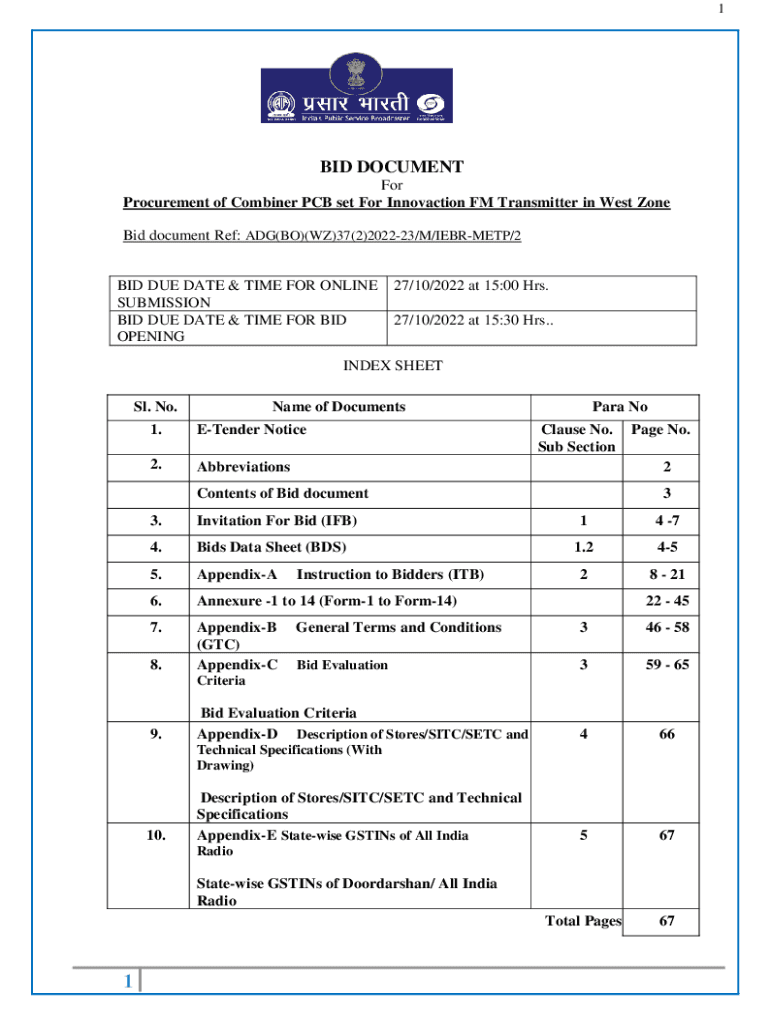 1BID DOCUMENT For Procurement of Combiner PCB set For Innovation FM Transmitter in West Zone Bid document Ref: ADG(BO)(WZ)37(2)202223/M/CERMET/2BID DUE DATE & TIME FOR ONLINE SUBMISSION BID DUE DATE