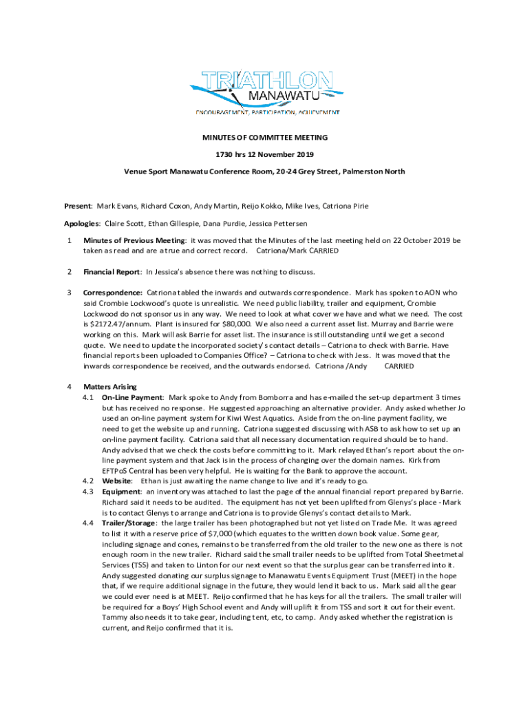Venue Sport Mandate Conference Room, 2024 Grey Street, Palmerston NorthPresent: Mark Evans, Richard Colon, Andy Martin, Raj Tokyo, Mike Ives,