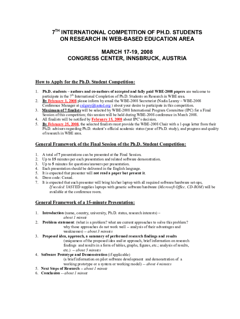 7TH INTERNATIONAL COMPETITION OF Ph.D. STUDENTS ON RESEARCH IN WEBBED EDUCATION AREA MARCH 1719, 2008 CONGRESS CENTER, INNSBRUCK, Austria to Apply for the Ph.D. Student Competition: 1. 2. 3. 4. 5.