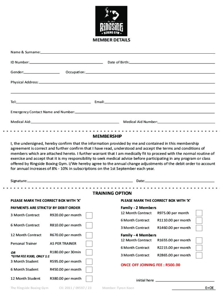 MEMBER DETAILS Name & Surname: ID Number: Gender:Date of Birth: Occupy on:Physical Address:Tel:Email:Emergency Contact Name and Number: Medical Aid:Medical Aid Number:MEMBERSHIP I, the undersigned,