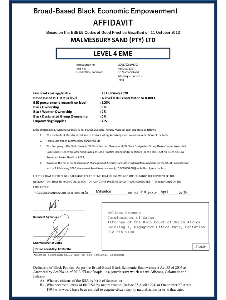 Broadband Black Economic EmpowermentAFFIDAVIT Based on the BB BEE Codes of Good Practice Gazetted on 11 October 2013MALMESBURY SAND (PTY) LEVEL 4 EME Registration no: VAT no: Head Office, Location:Financial