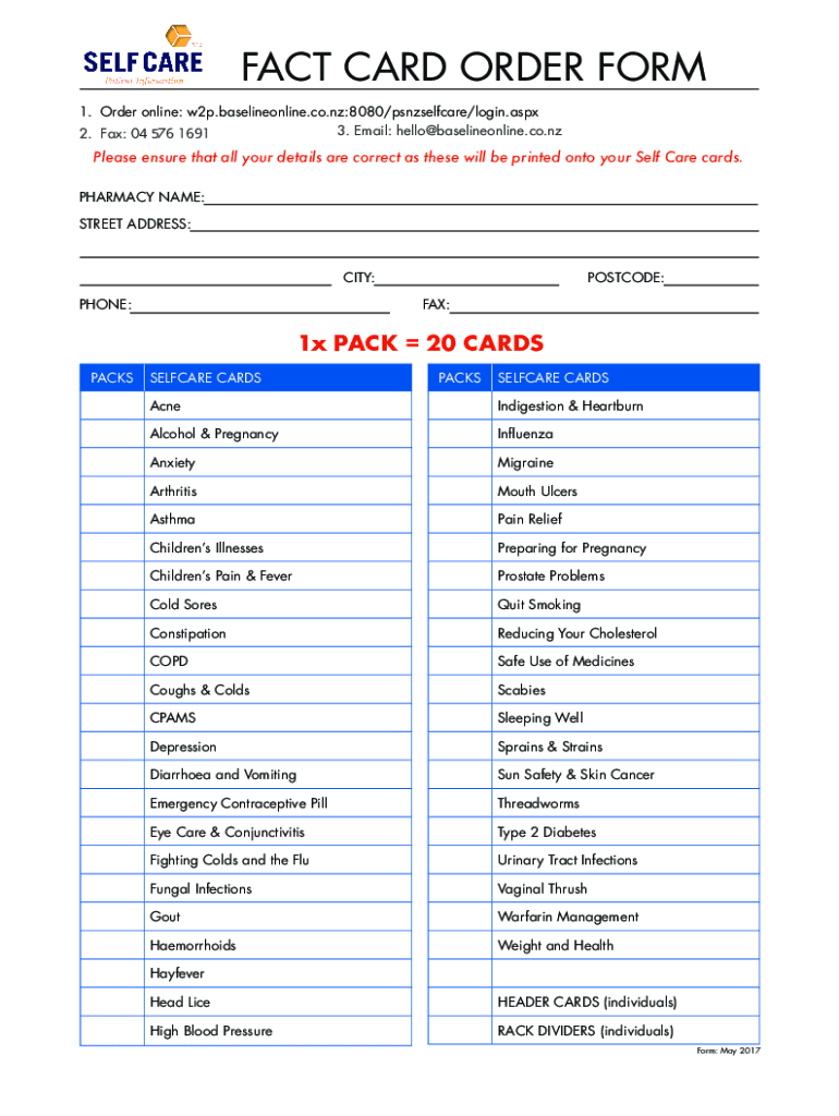 Information such as quantity of fact cards needed, shipping address, and contact information must be reported on the fact card order form.