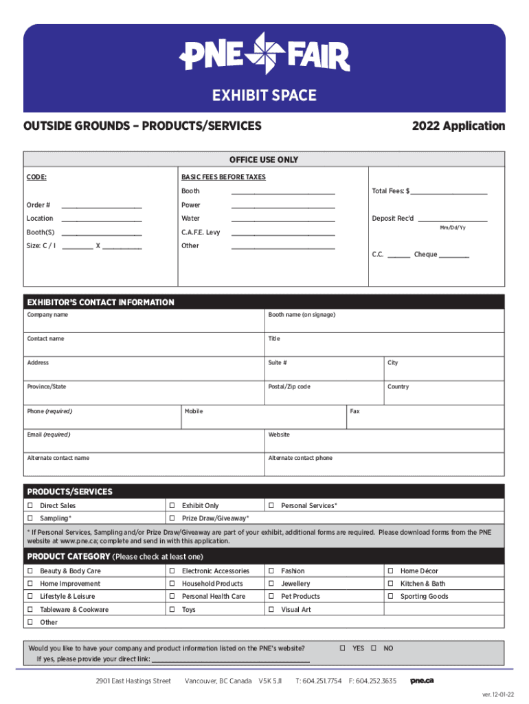 EXHIBIT SPACE OUTSIDE GROUNDS PRODUCTS/SERVICES2022 ApplicationOFFICE USE ONLY CODE:BASIC FEES BEFORE TAXES Booth___Order #___Power___Location___Water___Booth(S)___C. A.F.E. Levy___Size: C / I___