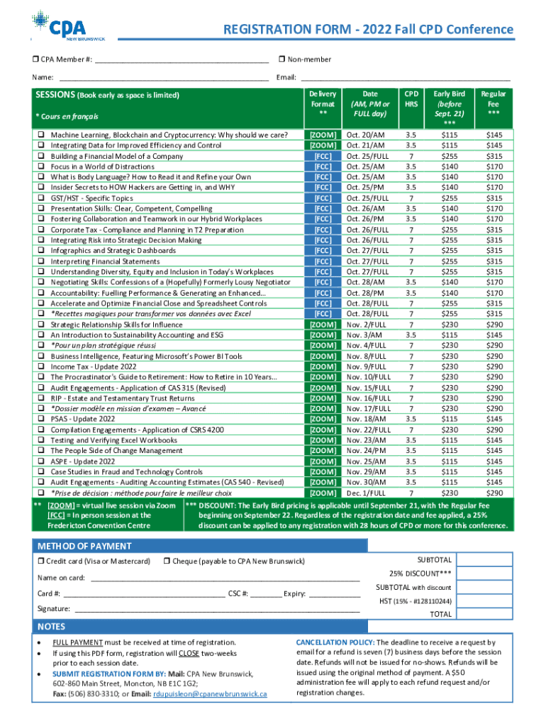REGISTRATION FORM 2022 Fall CPD Conference CPA Member #: ___ NonmemberName: ___ Email: ___SESSIONS (Book early as space is limited)Delivery Format **Date (AM, PM or FULL day)CPD Early Bird Regular