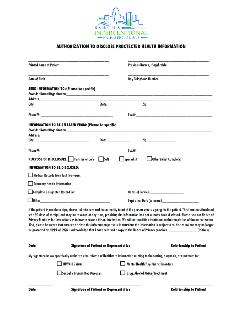 AUTHORIZATION TO DISCLOSE PROTECTED HEALTH INFORMATION ___ Printed Name of Patient___ Previous Names, if applicable___ Date of Birth___ Day Telephone Number SEND INFORMATION TO: (Please be specific)