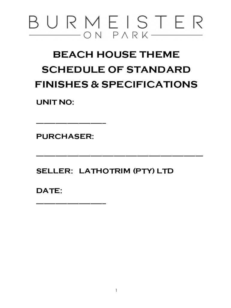 BEACH HOUSE THEME SCHEDULE OF STANDARD FINISHES & SPECIFICATIONS UNIT NO: ___ PURCHASER: ___ SELLER: LATHOTRIM (PTY) LTD DATE: ___11.GENERAL1.1NOTE This specification to be read in conjunction with