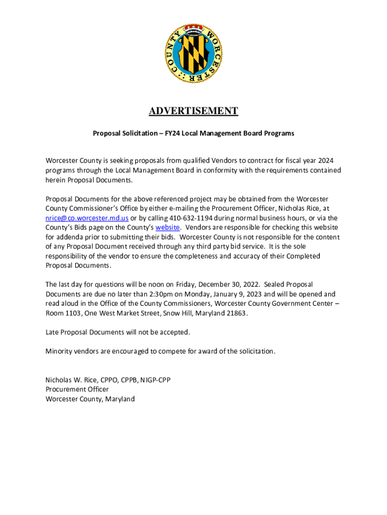 ADVERTISEMENT Proposal Solicitation FY24 Local Management Board Programs Worcester County is seeking proposals from qualified Vendors to contract for fiscal year 2024 programs through the Local Management